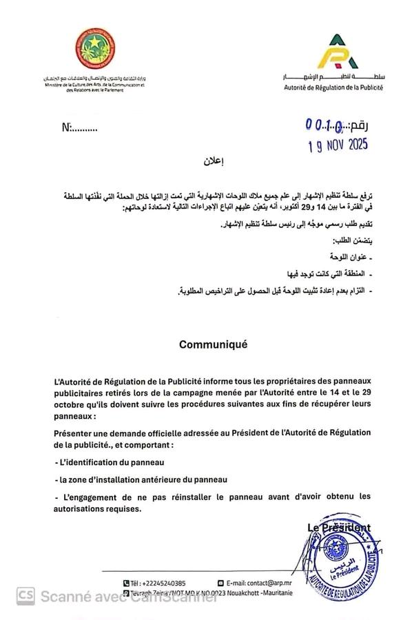 أعلنت سلطة تنظيم الإشهار عن فتح باب استعادة اللوحات الإشهارية التي أزيلت خلال الحملة التصحيحية المنفذة بين 14 و29 أكتوبر الماضي، مؤكدة أن العملية تأتي في إطار تنظيم المجال الإعلاني وضمان احترام المعايير القانونية.