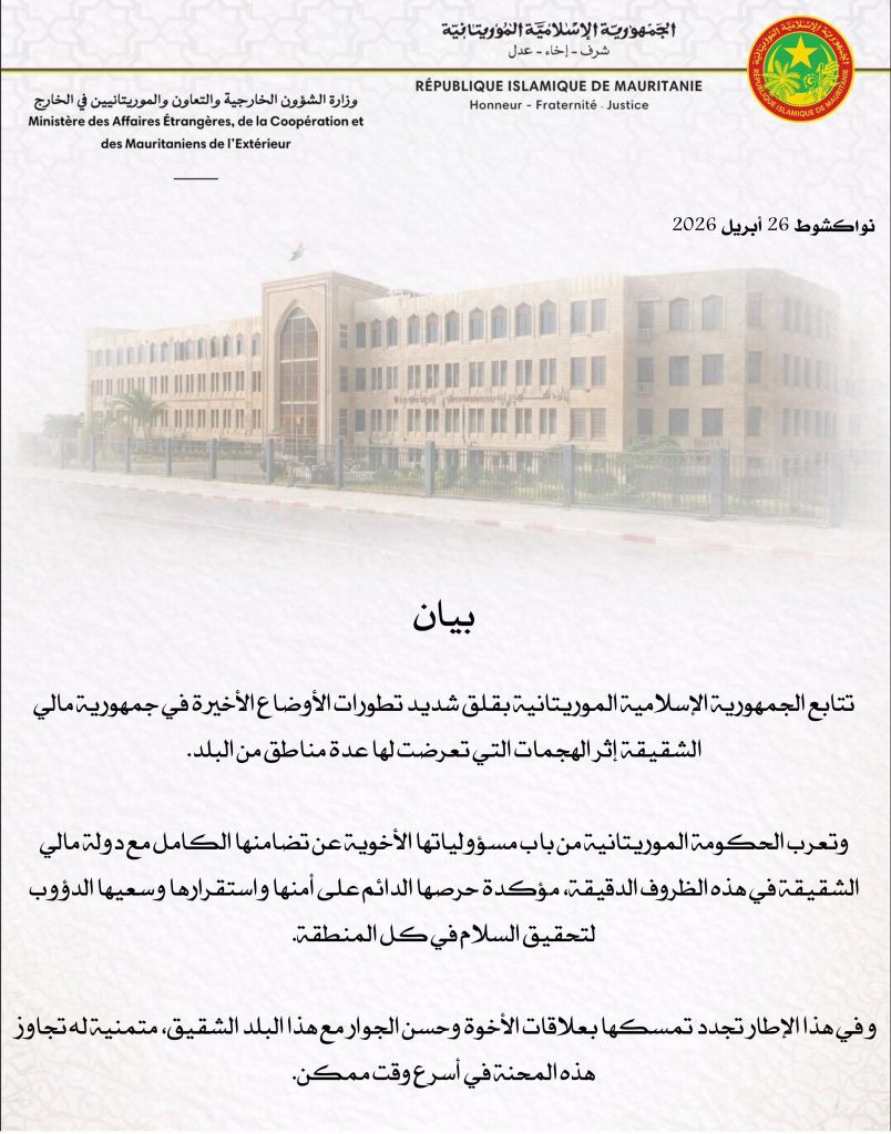“تتابع الجمهورية الإسلامية الموريتانية بقلق شديد تطورات الأوضاع الأخيرة في جمهورية مالي الشقيقة إثر الهجمات التي تعرضت لها عدة مناطق من البلد.