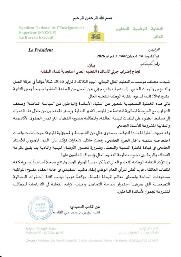 شهدت مختلف مؤسسات التعليم العالي الوطني، اليوم الثلاثاء 3 فبراير 2026، شللاً مؤقتاً في حركة العمل والتدريس والبحث العلمي، إثر تنفيذ توقفٍ جزئي عن العمل من الساعة العاشرة صباحاً وحتى الثانية عشرة زوالاً؛ تلبيةً لدعوة النقابة الوطنية للتعليم العالي.