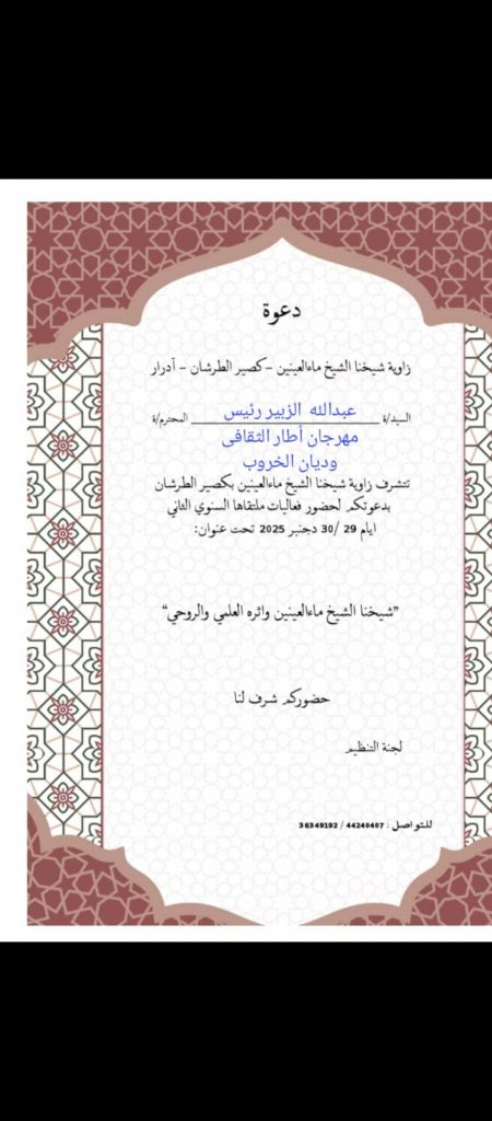 وجهت زاوية الشيخ ماء العينين دعوة لرئيس مهرجان أطار الثقافى وديان الخروب السيد عبدالله الشيخ الزبير لحضور ملتقاها الثقافى الثانى المنظم تحت عنوان شيخنا الشيخ ماء العينين وأثره العلمى والروحى وذلك أيام (29و 30 دجمبر 2025)