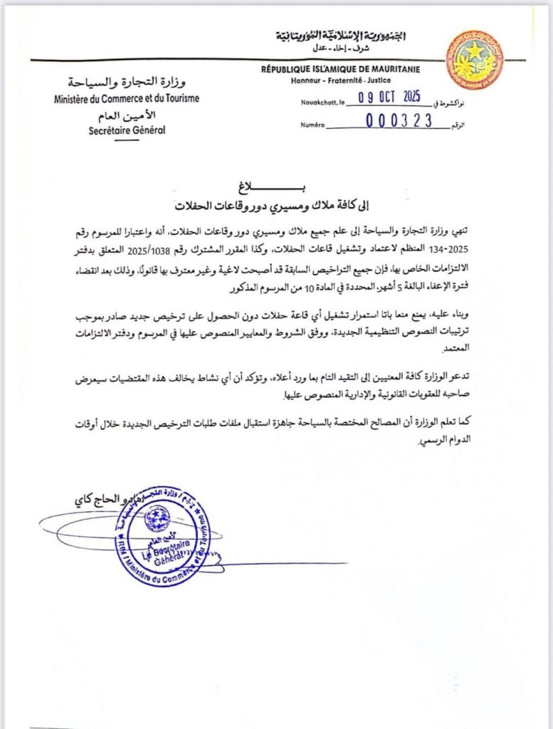 وأكدت الوزارة أنه بناء على ذلك فإن استمرار تشغيل أي قاعة حفلات دون الحصول على ترخيص جديد صادر بموجب ترتيبات النصوص التنظيمية الجديدة ووفق الشروط والمعايير المنصوص عليها في المرسوم ودفتر الانتزامات يعد ممنوعا منعا باتا